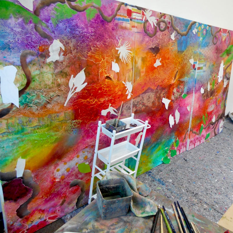 Ihre Bilder fertigt Franziska Schmalzl in ihrem Atelier bei Wien gerne als Auftragsarbeit an. So ist jedes Werk genau auf die Menschen, für die es gemalt wird, und auf den Ort, an dem es wirken soll, abgestimmt.
